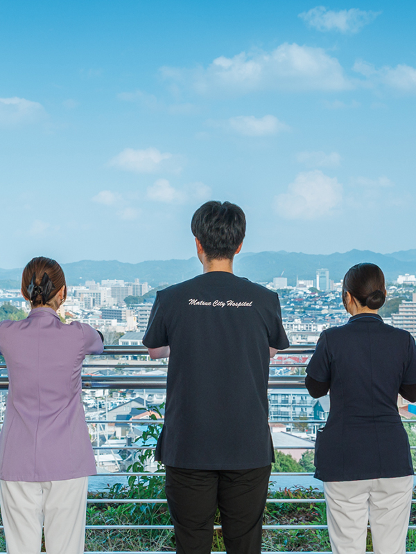 「市⺠から愛され信頼される病院」の実現に向け、①安⼼・安全な患者中⼼の医療、②チーム医療の質向上、③経営改善による持続可能な運営体制という三つの柱で病院機能の充実を図っています。
