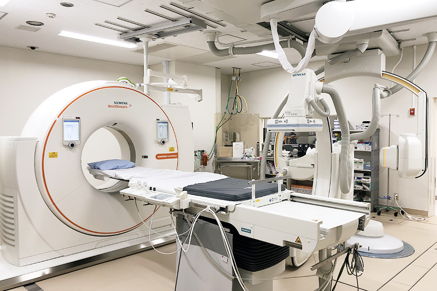 2022年10月に2方向から同時撮影ができるFPD搭載型血管撮影装置とCT装置が一体型となった最新型のIVR-CT装置を導入しました。IVR(InterVentionalRadiology)とは、X線透視下でカテーテルと呼ばれる細い管を足の付け根の動脈血管から、目的部位の場所まで進め、血管の造影検査や治療(血管を広げる、詰める、薬を投与する)を行うことです。