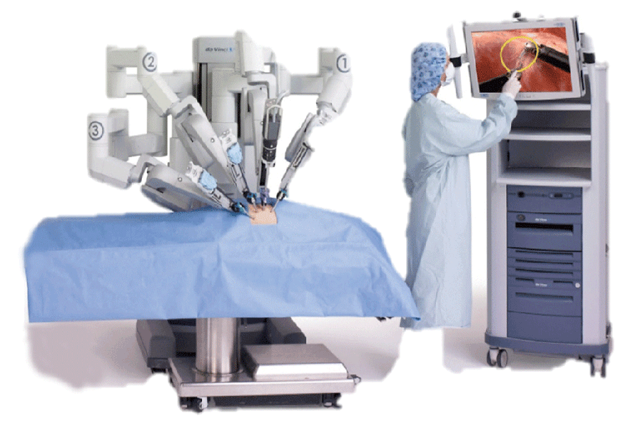 ロボット支援手術とは、腹腔鏡手術が進化した形の手術です。即ち、お腹に小さな穴を数カ所あけ、そこにトロカーという鉗子やカメラを出し入れするための筒を挿入します。トロカーを手術支援ロボットへドッキング(接合)して、遠隔操作により術者が鉗子やカメラを操作して手術を行います。