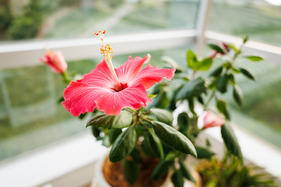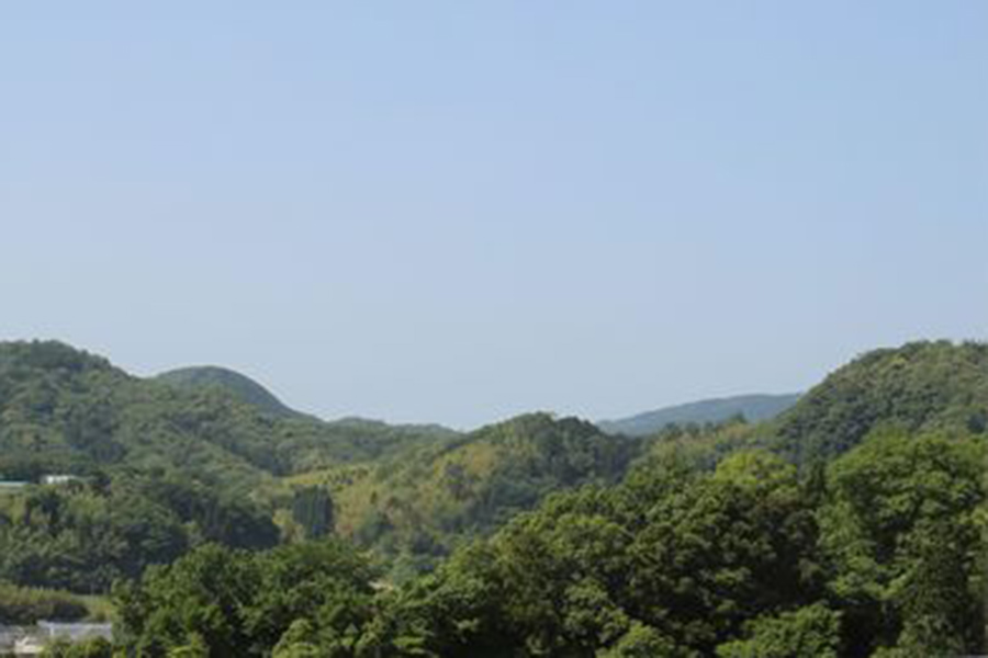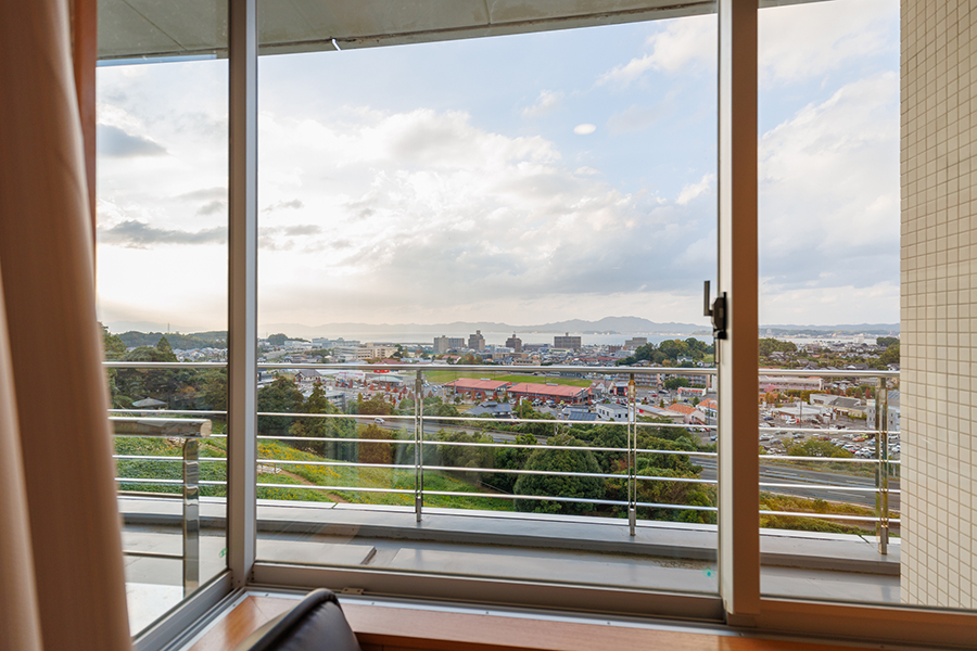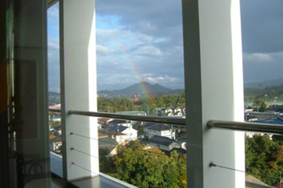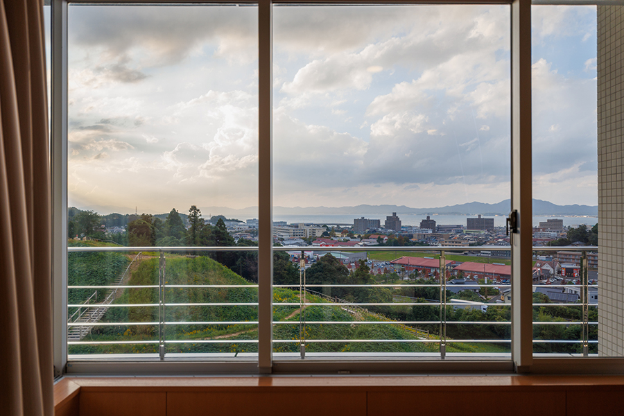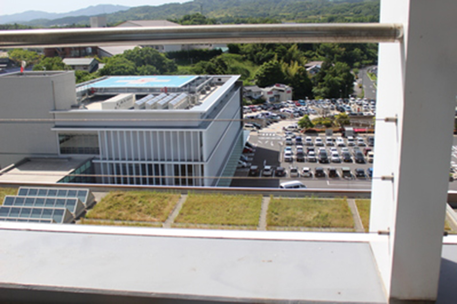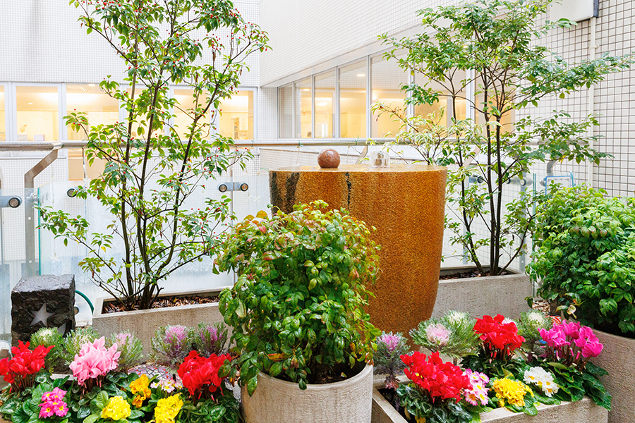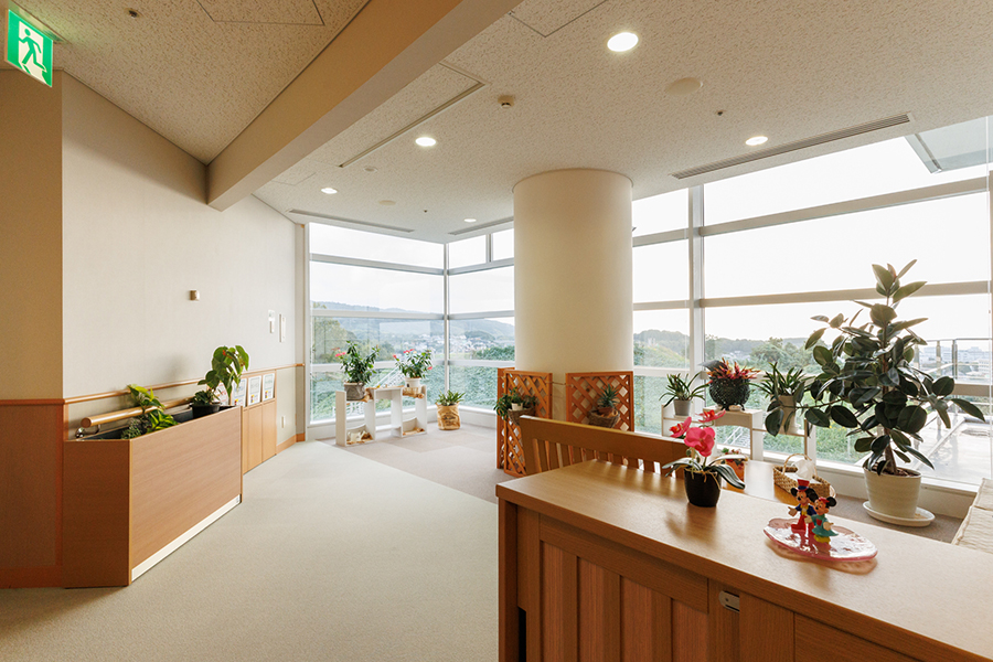 病棟の端にあり、暖かな光が差し込むホッとできる場所です。四季折々の花や緑が並んでおり、中でも夏になると真っ赤なハイビスカスが花開きます。また、正面には田和山遺跡が見え、季節毎に色々なかおを見せています。