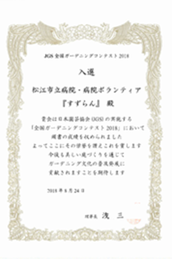 園芸グループの皆さんが整備された癒しの庭「和み」が、日本園芸協会が主催する「全国ガーデニングコンテスト2018」に入選しました。