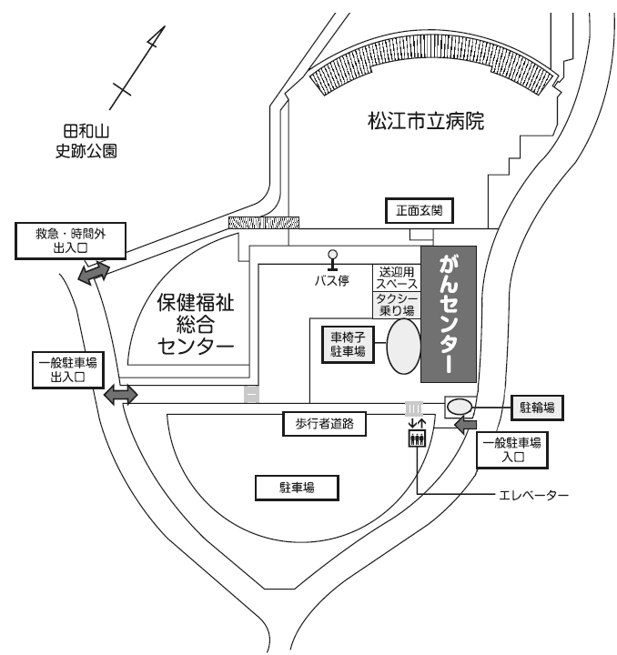 - 敷地は北側に松江市立病院、東側にがんセンター、西側に松江市保健福祉総合センター、中央と北の1階、地下に駐車場があります。