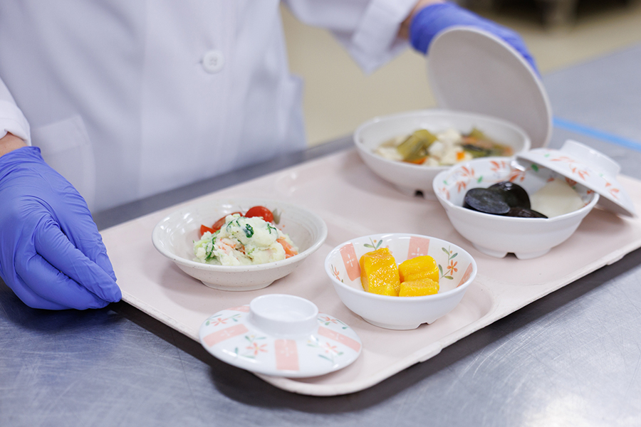 入院患者さんの病態に応じた食事を医師の指示に基づいて、安全かつ衛生的に提供しています。