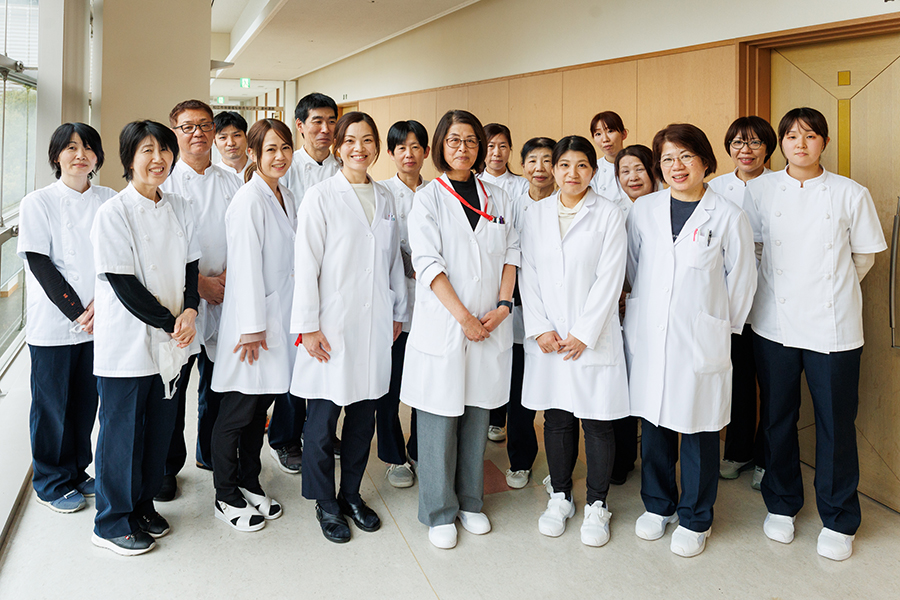 また、NST(栄養サポートチーム)、褥瘡回診、嚥下チーム、糖尿病チーム、心臓リハビリテーションチーム、緩和ケアチーム等、チーム医療の中に管理栄養士が関わり、食生活の改善、疾患の悪化予防、栄養改善につながるよう適切な栄養管理の実施をチーム一丸となって取り組んでいます。