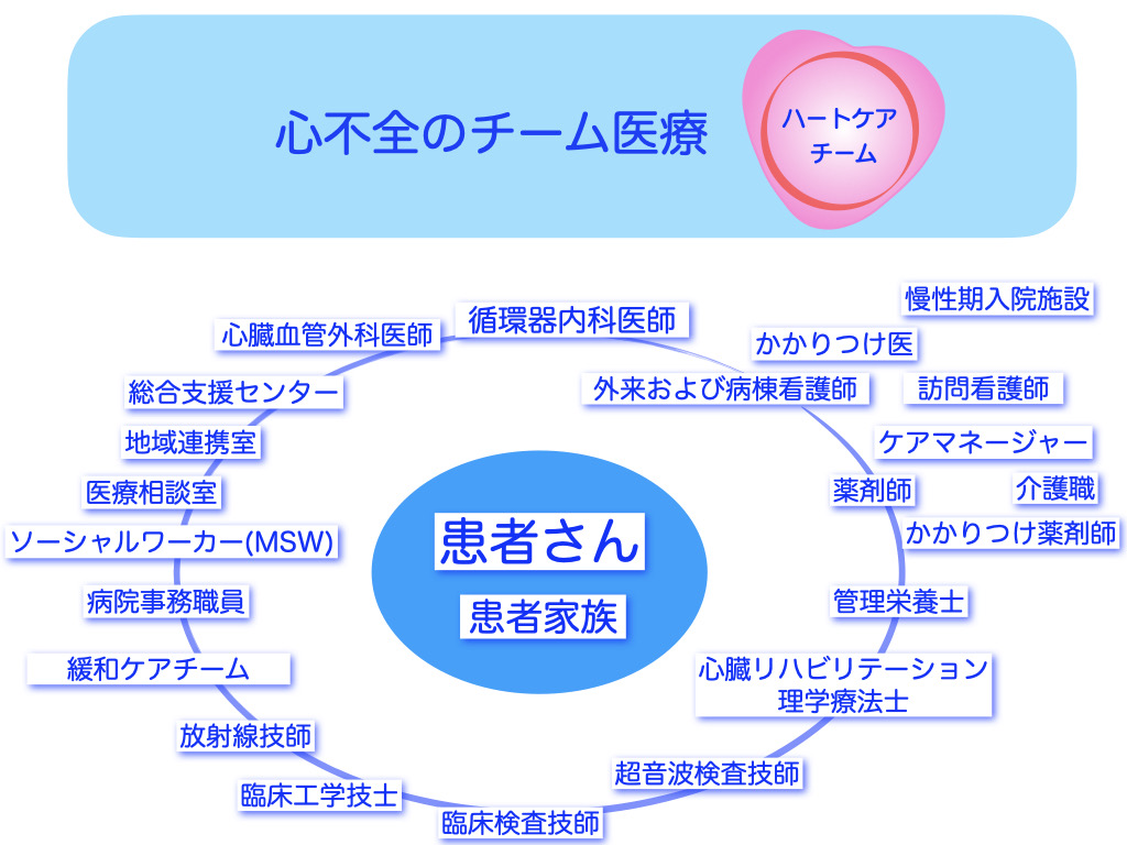 医師を中⼼に、看護師、薬剤師、理学療法⼠、臨床検査技師、管理栄養⼠など15⼈の医療専⾨職が⽇本循環器学会認定⼼不全療養指導⼠の資格に合格し、専⾨的な知識を共有しながらチーム医療を実践しています。