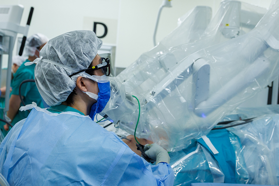 前立腺癌・腎癌・尿路上皮癌(腎盂尿管癌および膀胱癌)などに対して、手術と薬物療法の両面から高度ながん診療を行っています。当院は2019年10月に低侵襲手術の最先端機器である手術支援ロボット(ダヴィンチ)を松江市で最初に導入し、同年11月より前立腺癌に対するロボット支援前立腺全摘除術を開始しました。さらに、2020年11月には小径腎癌に対するロボット支援腎部分切除術、2024年9月には筋層浸潤性膀胱癌に対するロボット支援膀胱全摘除術、2025年6月には大径腎癌に対するロボット支援腎摘除術、同年9月には腎盂尿管癌に対するロボット支援腎尿管全摘除術を開始し、着実に実績を積み重ねています。