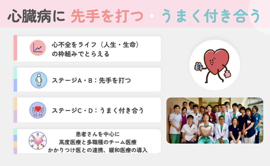 患者のより良いLIFE(生命と人生)のために、院内外の多職種とのチーム医療、心臓血管外科や心移植治療が可能な施設との連携、地域のかかりつけ医やケアマネージャーなど在宅に関わるスタッフと連携して最新の治療をとりいれながら、ともに「ハートケアチーム」として心不全の治療とケアをすすめ、心臓病をもつ患者に最良の治療とケアができるよう努力しています。また、地域連携パスを活用し、かかりつけ医との連携を強化していきます。