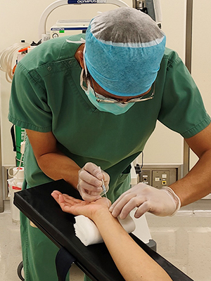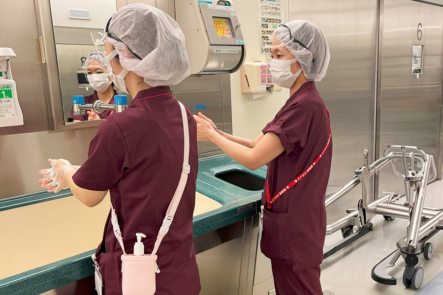 手術侵襲を最小限にし、二次合併症を予防するための安全管理(体温・体位管理、手術機材・機器の適切な管理など)と周術期(術前・術中・術後)における継続看護の実践を主にしています。基本的には、手術室で活動していますが、麻酔科の術前外来や病棟での術前訪問や術後訪問で、お話しを伺いに行くことがあります。