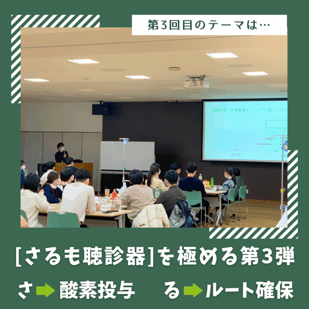 「さるも聴診器」を極める!第3弾・・・今回のテーマは、『さ⇨酸素投与』『る⇨ルート確保』でした。