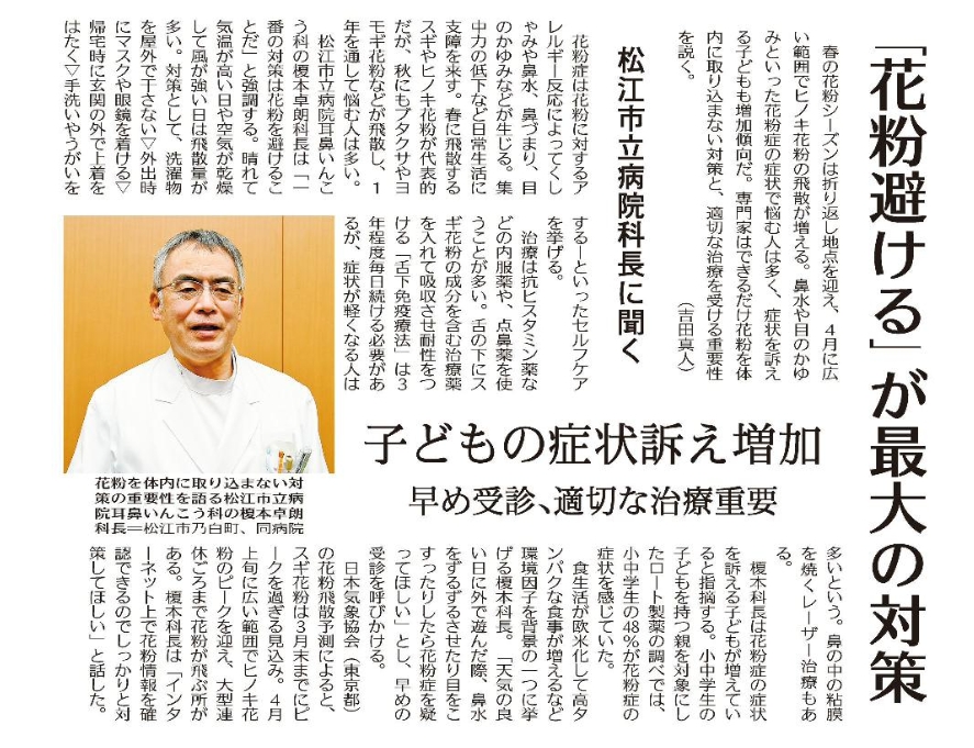 3/31山陰中央新報記事「花粉避けるが最大の対策」で耳鼻いんこう科 榎本卓朗科長がお話しました