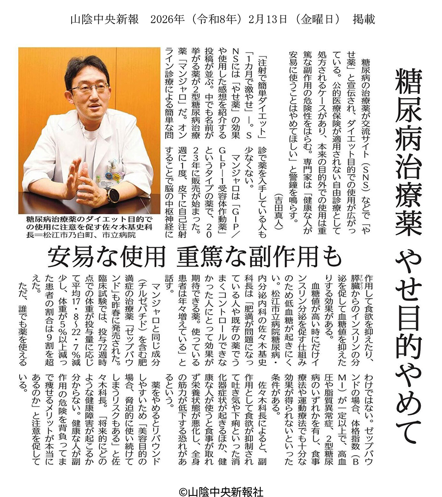 2/13山陰中央新報記事「糖尿病治療薬 やせ目的やめて」で糖尿病・内分泌内科 佐々木基史科長がお話しました