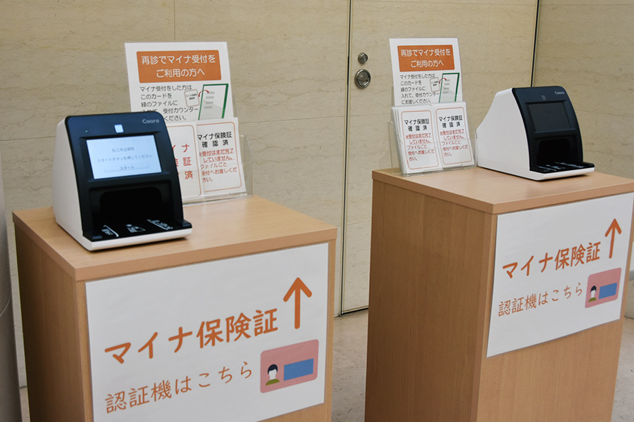 外来受診する際は毎回マイナンバーカードを再来受付機の横、もしくは1番、5番、6番、7番、がんセンター1階受付窓口に設置してある認証機を通してください。